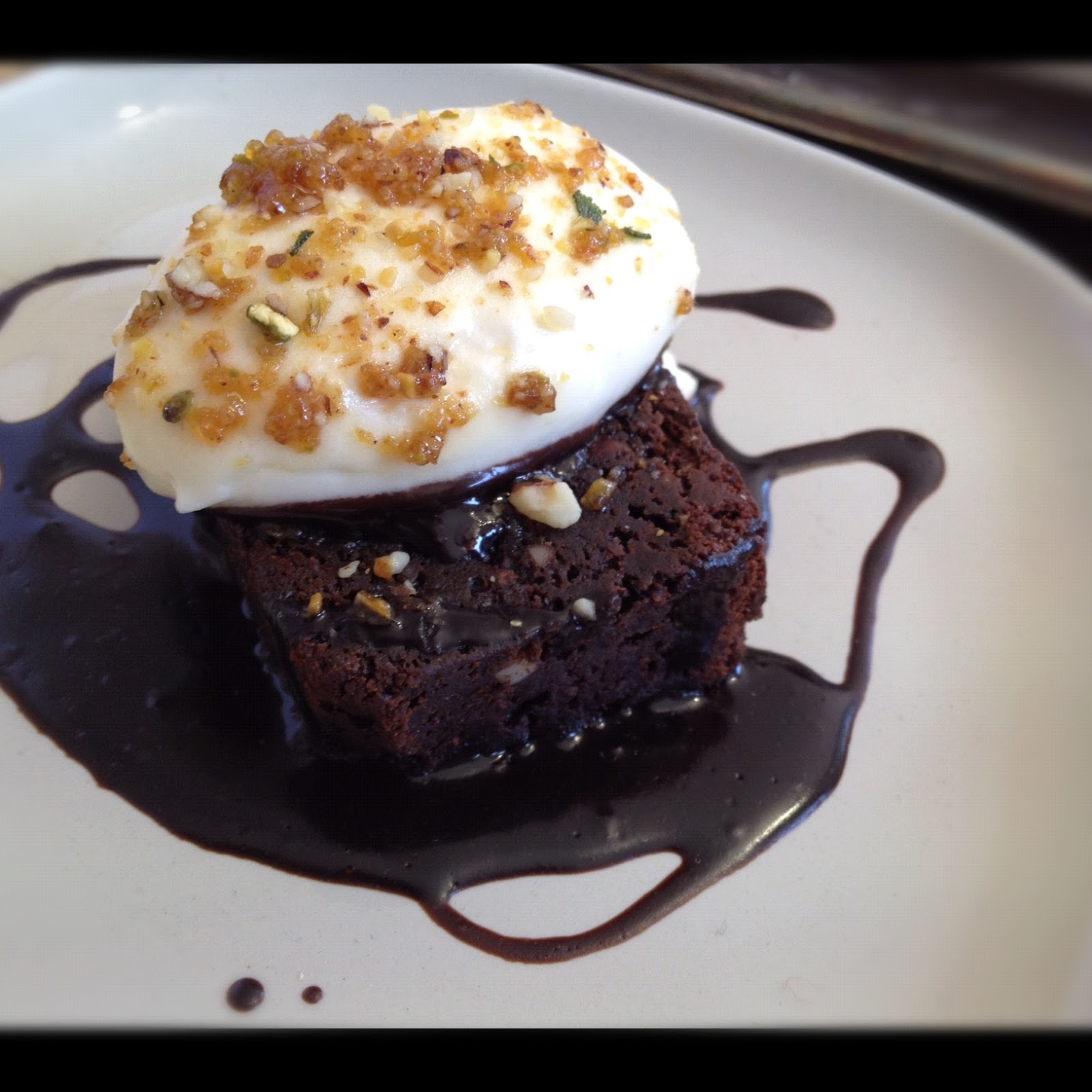 Heavenly: Chocolate & Spelt Brownie, almond praline, vanilla cream & chocolate sauce. Matched with Nespresso Volluto Grand Cru. |